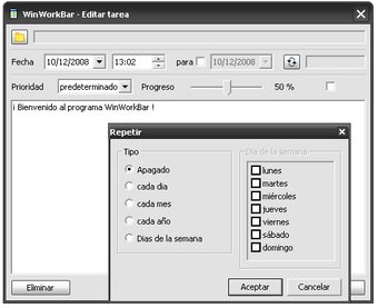 Tres pestañas contienen un listado cronológico de tareas, uno de notas y una vista diaria a través de la cual WinWorkBar muestra el progreso para cada acción. Crear o editar ambos tipos de ítem es muy fácil. Puedes indicar el progreso parcial y asociar a cada tarea una alarma puntual o periódica.